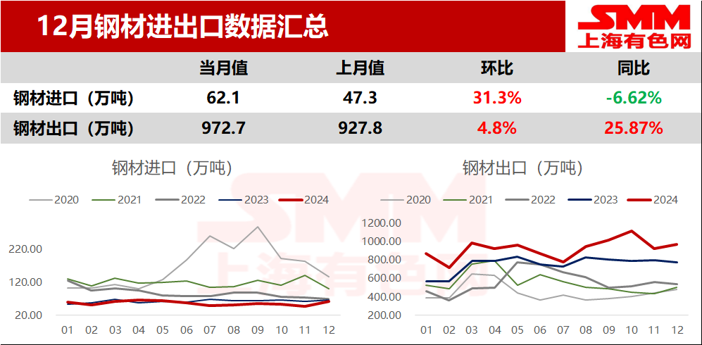 On the import side, China imported 621,000 mt of steel in December, up 31.3% MoM, maintaining a net export status. In December, China's net steel exports reached 9.106 million mt, up 28.93% YoY.