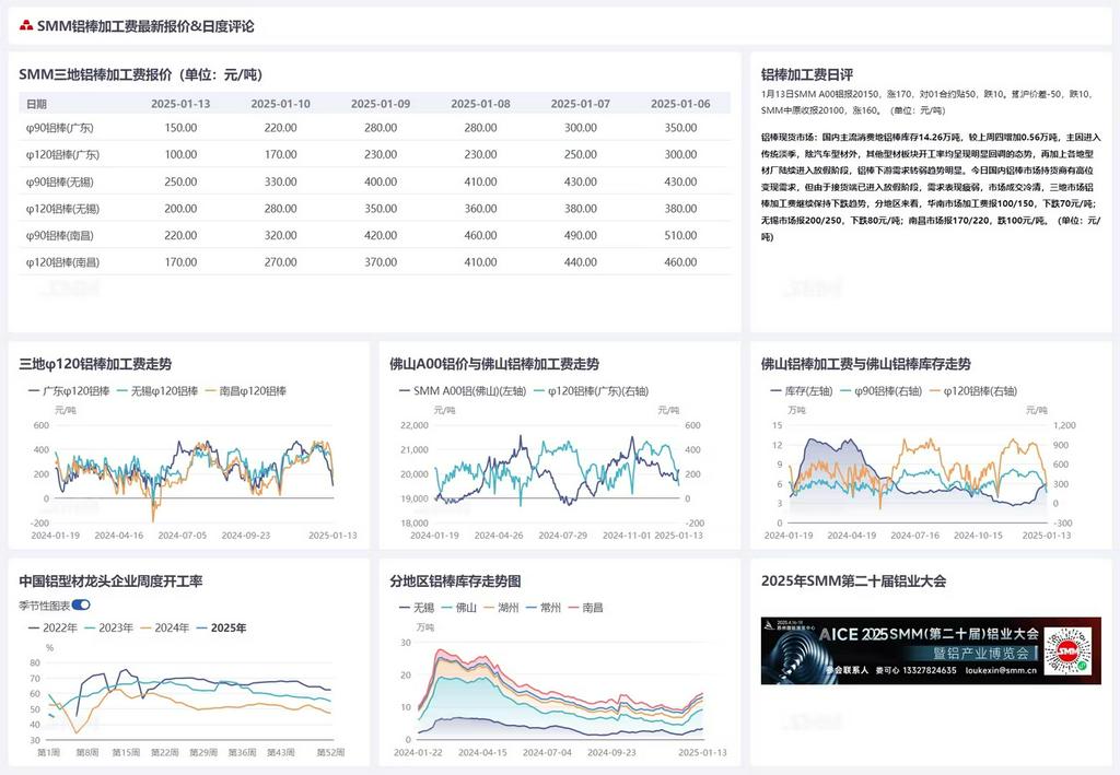 Aluminum billet spot market: Domestic mainstream consumption areas reported an aluminum billet inventory of 142,600 mt, an increase of 5,600 mt WoW. The main reason was the entry into the traditional off-season, where operating rates in all extrusion sectors except automotive extrusion showed a significant decline. Additionally, extrusion plants in various regions have gradually entered the holiday phase, leading to a clear weakening trend in downstream demand for aluminum billets. Today, domestic aluminum billet suppliers showed a willingness to liquidate at high prices, but due to the purchasing side entering the holiday phase, demand remained weak, and market transactions were sluggish. Processing fees for aluminum billets in three major markets continued to decline. By region, the South China market reported processing fees at 100-150 yuan/mt, down 70 yuan/mt; the Wuxi market at 200-250 yuan/mt, down 80 yuan/mt; and the Nanchang market at 170-220 yuan/mt, down 100 yuan/mt. (Unit: yuan/mt)