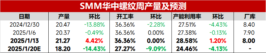 During the survey period (January 6 to January 13), the operating rate of rebar rolling lines in Central China steel mills remained unchanged, while the capacity utilisation rate increased slightly. The capacity utilisation rate and operating rate of wire rod rolling lines both declined.