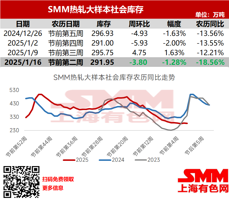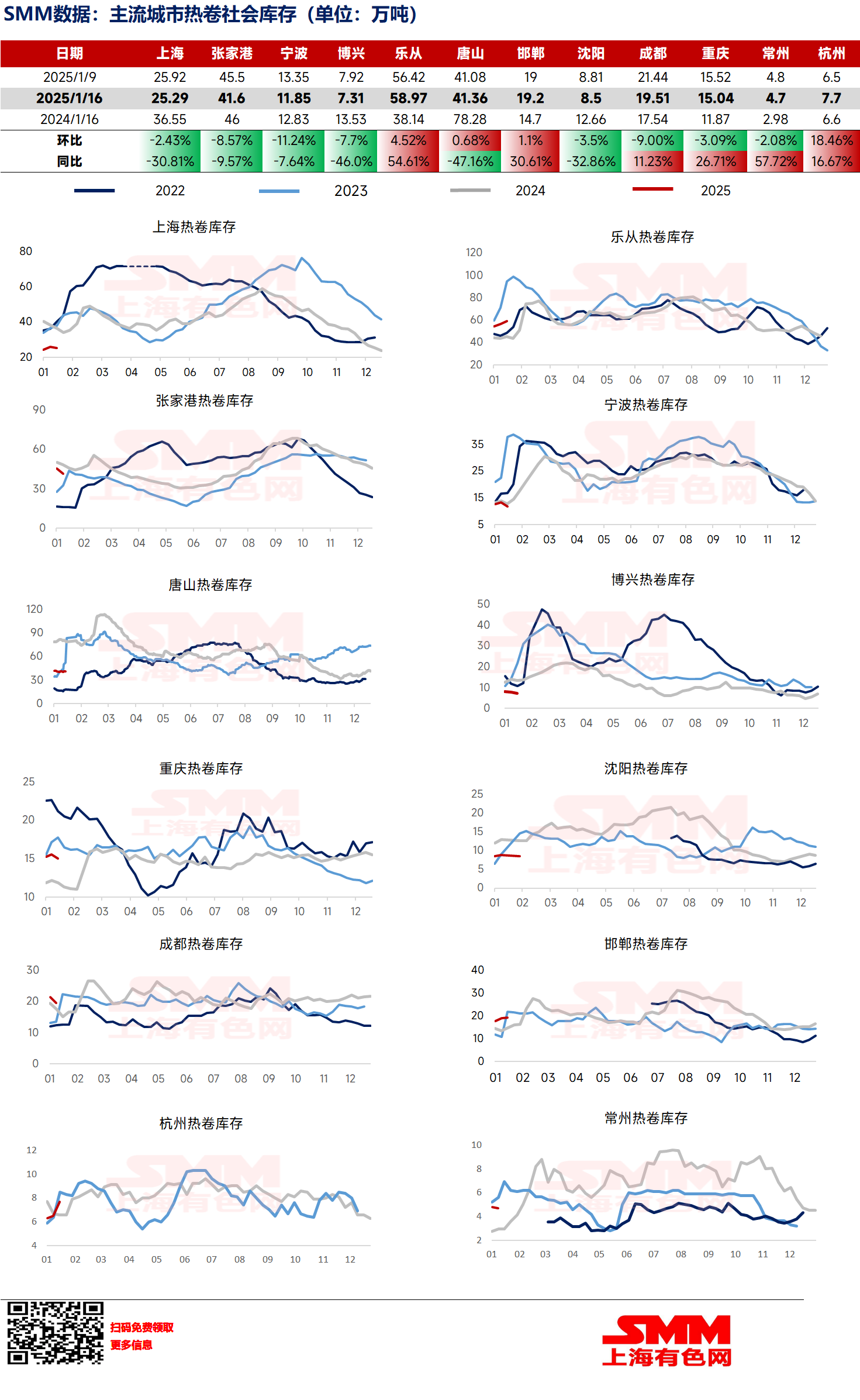 According to SMM statistics, the HRC social inventory across 86 warehouses nationwide (large sample) was 2.9195 million mt this week, down 38,000 mt WoW (-1.28%) and down 18.56% YoY based on the lunar calendar. This week, the national social inventory declined. By region, east China and north-east China saw destocking, while south China, central China, and north China continued the inventory buildup trend.