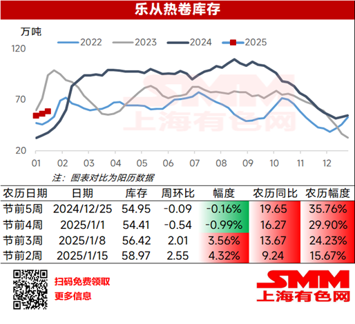This week, HRC inventory in Lecong was 58,970 mt, up 25,500 mt WoW (+4.32%), with a lunar YoY increase of 92,400 mt (+15.67%).