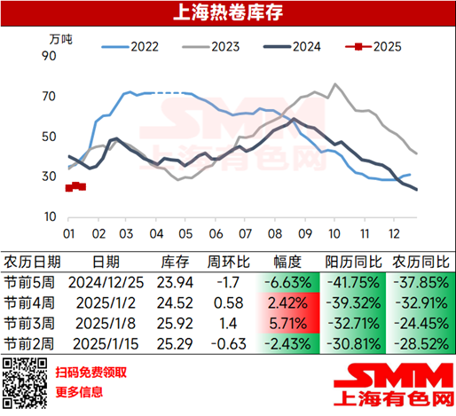 This week, HRC inventory in Shanghai was 252,900 mt, down 6,300 mt WoW (-2.43%), with a Gregorian YoY decline of 30.81% and a lunar YoY decline of 28.52%.