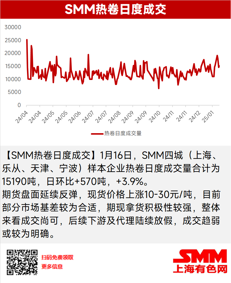 [SMM HRC Daily Trading Volume] On January 16, the daily trading volume of HRC samples from four cities (Shanghai, Lecong, Tianjin, Ningbo) surveyed by SMM totaled 15,190 mt, up 570 mt or 3.9% WoW.