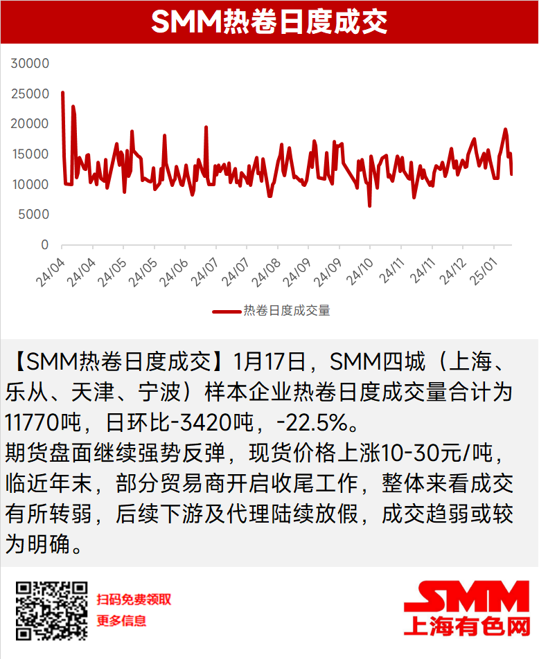[SMM HRC Daily Trading Volume] On January 17, the daily trading volume of HRC samples from SMM's four cities (Shanghai, Lecong, Tianjin, Ningbo) totaled 11,770 mt, down 3,420 mt or 22.5% MoM.