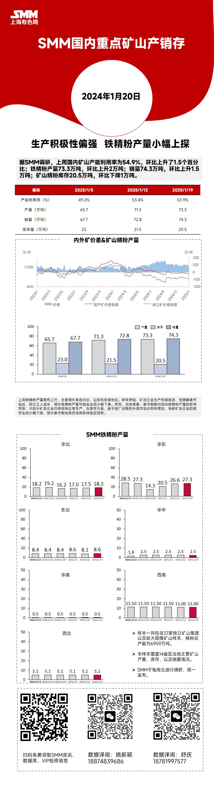 According to SMM's survey data, the domestic mines' capacity utilisation rate reached 54.9% last week, up by 1.5% from the previous week. Iron ore concentrates production rose to 733,000 mt, an increase of 20,000 mt, while mine concentrate inventory decreased by 10,000 mt to 205,000 mt. The slight increase in iron ore concentrates production last week mainly came from Hebei, Shandong, and Anhui regions. At the beginning of the new year, mine and beneficiation plants showed high production enthusiasm. However, as the Chinese New Year approaches, some workers are returning to their hometowns, and iron ore concentrates production is expected to see a slight decline. Overall, the impact of the Chinese New Year holiday on domestic iron ore concentrates production is limited, as most mine and beneficiation plants will maintain normal operations. On the inventory side, due to the recent restocking activities by steel mills, the inventory of mine and beneficiation plants saw a slight decrease and is expected to remain stable during the Chinese New Year holiday.