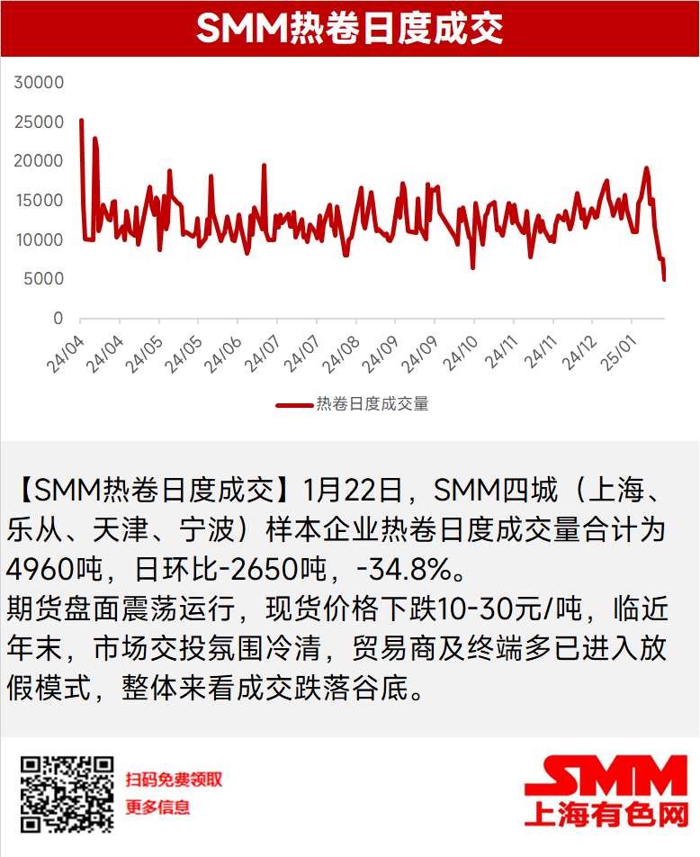 [SMM HRC Daily Trading] On January 22, the daily trading volume of HRC from SMM's four sampled cities (Shanghai, Lecong, Tianjin, Ningbo) totaled 4,960 mt, down 2,650 mt or 34.8% MoM.