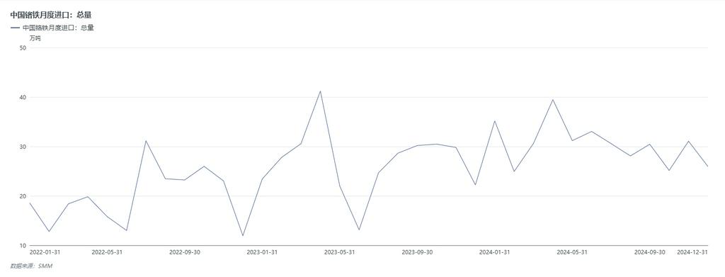 According to Chinese customs statistics, China's imports of high-carbon ferrochrome in December 2024 reached 259,600 mt, down 51,100 mt MoM, a decrease of 16.45%; up 37,200 mt YoY, an increase of 16.74%. From January to December 2024, China's total imports of high-carbon ferrochrome amounted to 3.6576 million mt, up 415,900 mt YoY, an increase of 12.83%. By country, in December, China imported 140,300 mt of high-carbon ferrochrome from South Africa and 83,700 mt from Kazakhstan. In December, imports of high-carbon ferrochrome through ordinary trade amounted to 202,300 mt, while Entry and Exit Goods in Bonded Control Areas and Entrepot Trade by Customs Special Control Area accounted for 55,600 mt.
