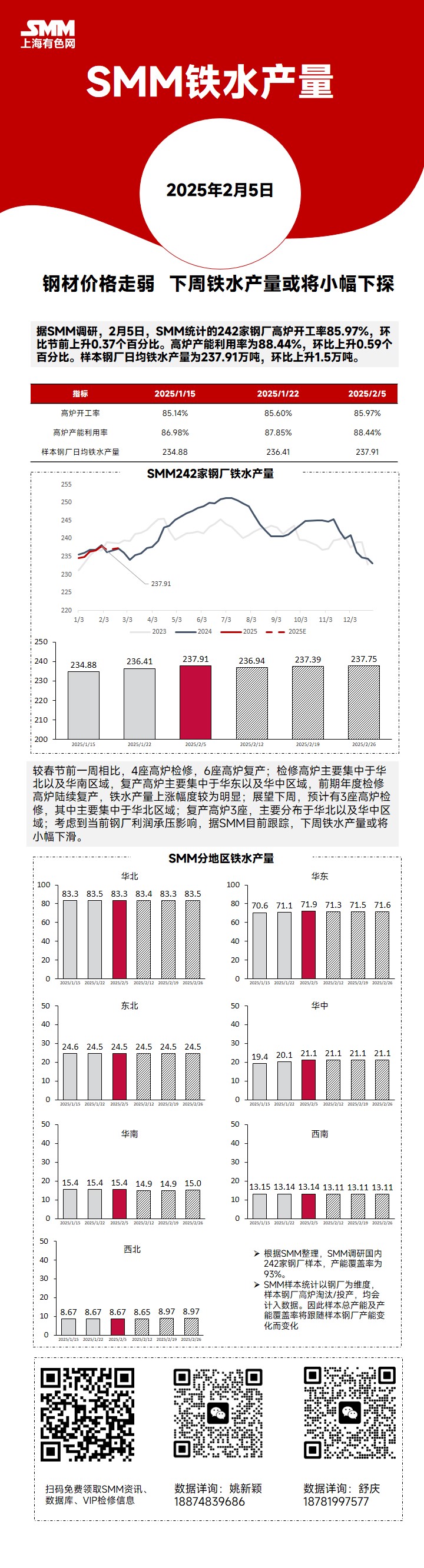 According to the SMM survey, as of February 5, the operating rate of blast furnaces at 242 steel mills surveyed by SMM was 85.97%, up 0.37 percentage points MoM. The blast furnace capacity utilisation rate was 88.44%, up 0.59 percentage points MoM. The daily average pig iron production of the sample steel mills was 2.3791 million mt, up 15,000 mt MoM.