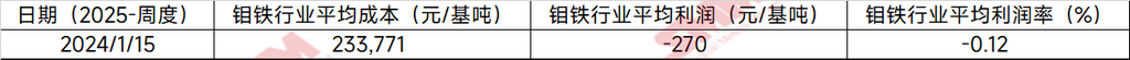 This week, the average cost in the ferromolybdenum industry was 233,771 yuan/mt, the average industry profit was -270 yuan/mt, and the average profit margin was -0.12%.