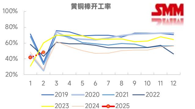 In January 2025, the operating performance of the copper billet industry was significantly impacted by the Chinese New Year holiday, aligning with market expectations. According to SMM, due to the holiday arrangements, most small and medium-sized enterprises ceased production and entered holiday mode by mid-January, while large copper billet enterprises typically began their holidays two to three days before Chinese New Year's Eve. However, prior to the holiday, overall market orders had already decreased, leading to a slowdown in workshop production. Compared to large enterprises, small and medium-sized enterprises experienced a more pronounced decline in operating rates due to their earlier holiday schedules. Additionally, the limited number of offers from overseas suppliers before the holiday resulted in tight brass supply in the market, further impacting the operating rates of copper billet producers.