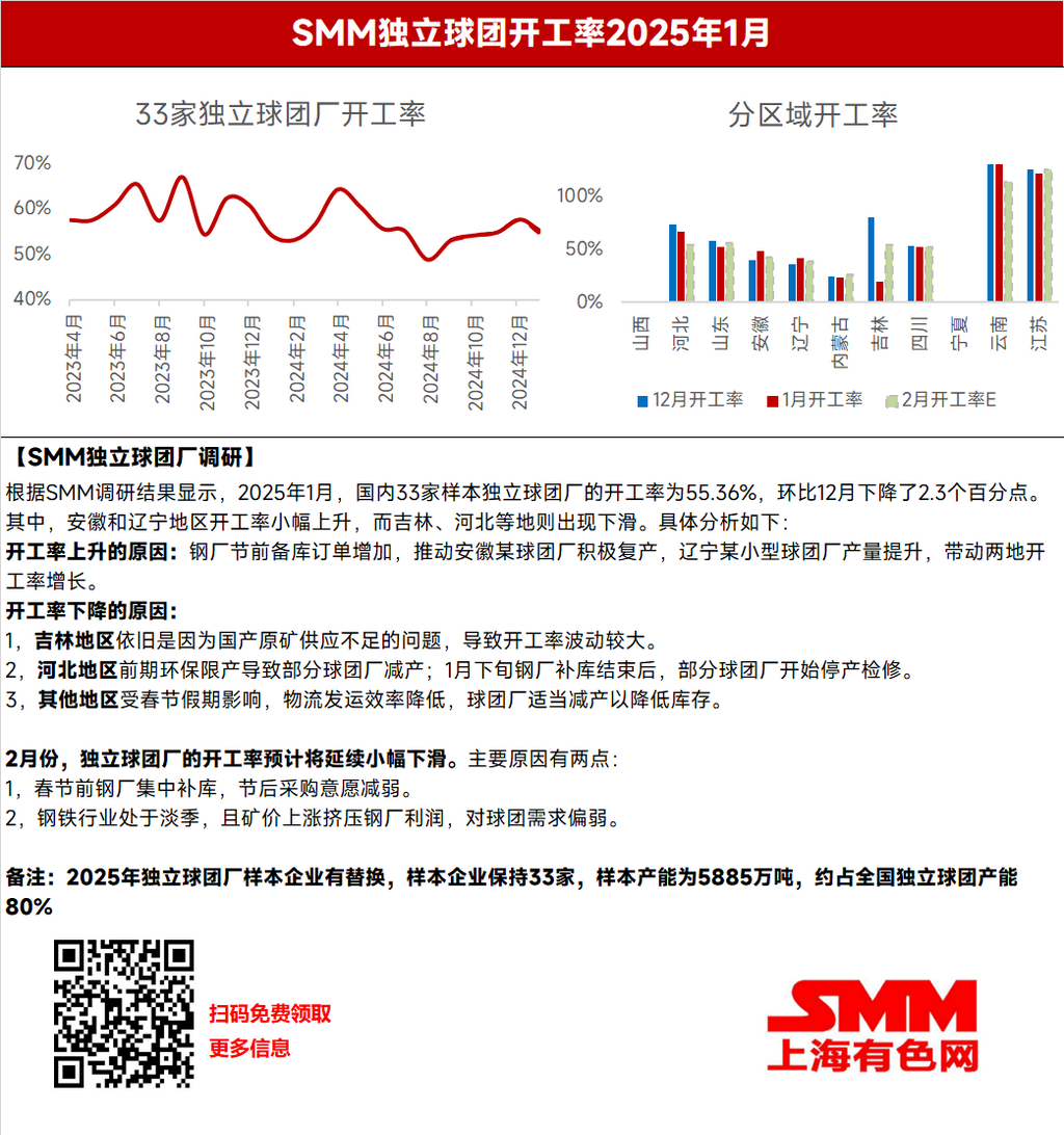 According to the SMM survey, in January 2025, the operating rate of 33 sampled independent pellet plants in China was 55.36%, down 2.3 percentage points MoM from December. Among them, the operating rates in Anhui and Liaoning slightly increased, while those in Jilin, Hebei, and other regions declined. For specific reasons, see the chart below: