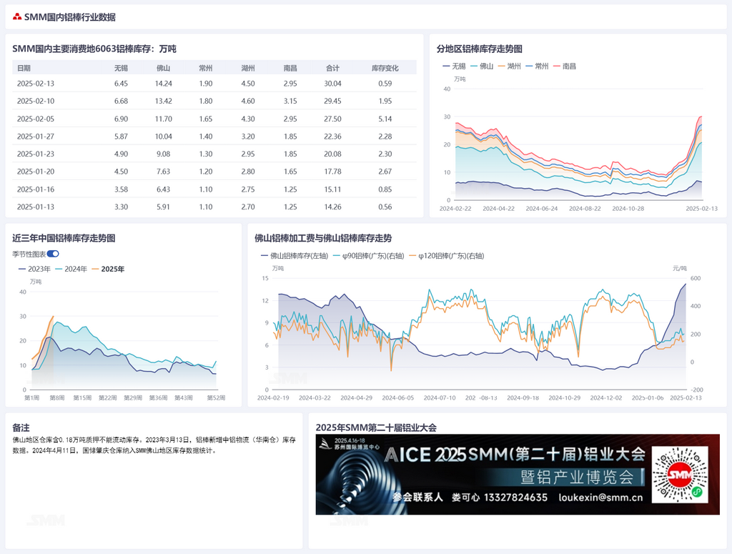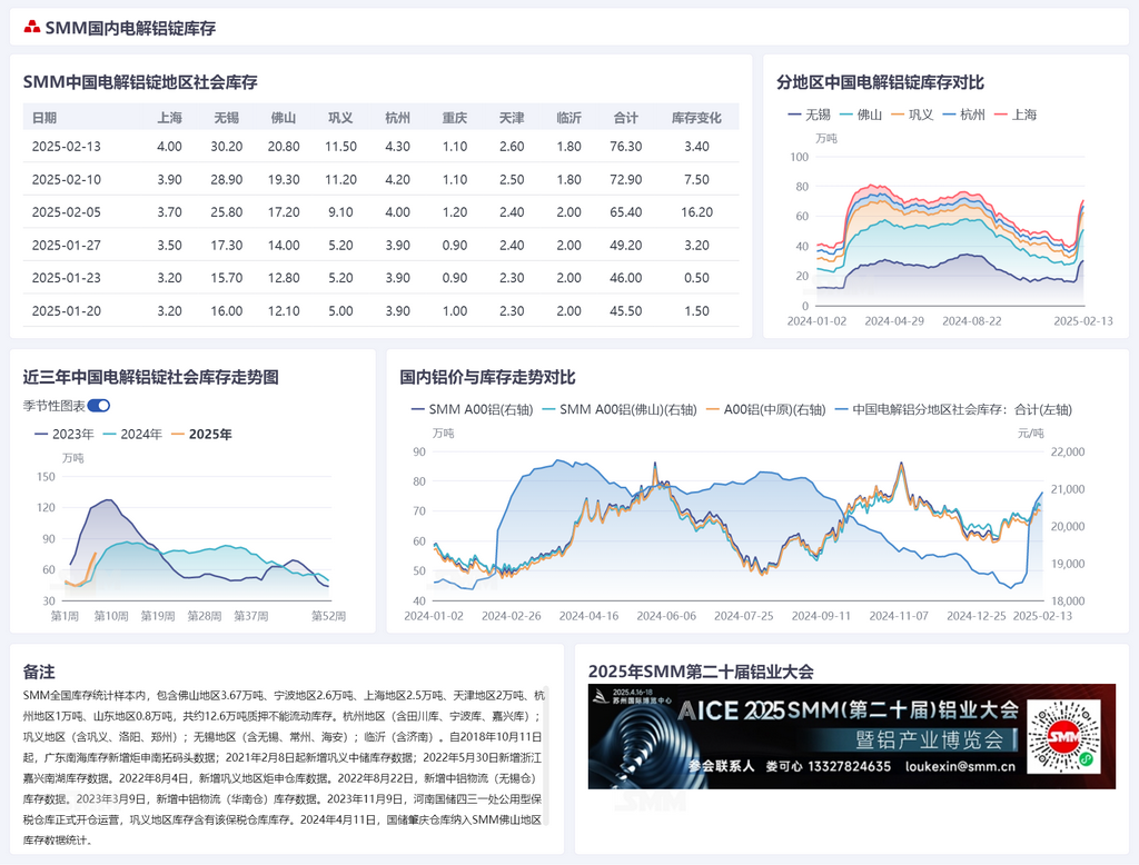 February 13, 2025 Aluminum Ingot and Aluminum Billet Inventory: Aluminum Inventory Continues to Rise, Aluminum Billet Inventory Surpasses the High Level of 300,000 [SMM Data]