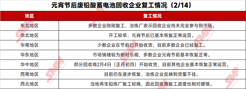 After the Lantern Festival holiday, the resumption progress of battery scrap recyclers varied by region, but the overall recovery trend showed steady growth. Based on the descriptions of secondary lead smelters and waste lead-acid battery recycling companies regarding the resumption progress of battery scrap recyclers in their provinces and nearby areas, as well as the raw material arrivals at smelters, SMM has compiled this article.