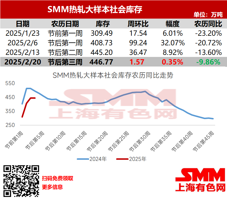 This week, HRC social inventory stood at 2.8399 million mt, up 9,900 mt WoW (+0.35%), down 7.78% YoY, and down 13.27% YoY on a lunar calendar basis.