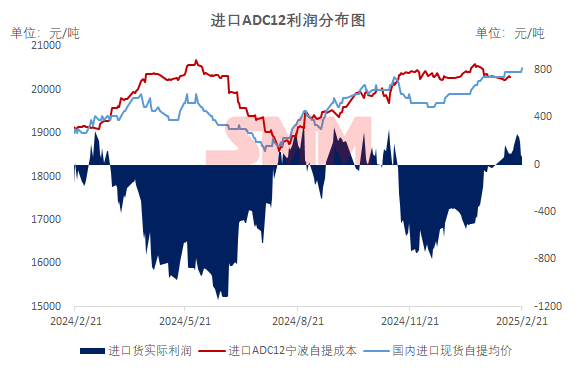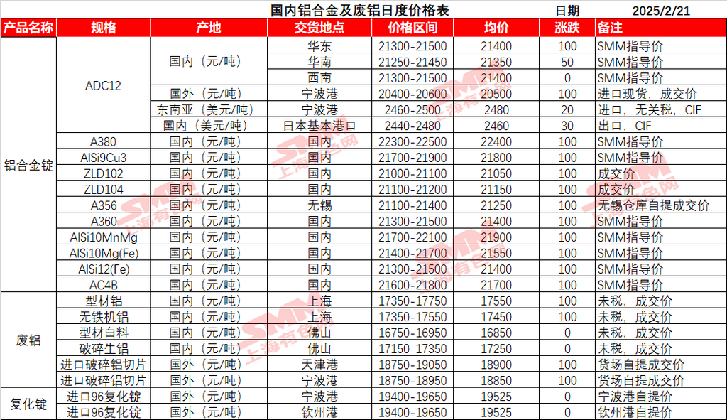 【Aluminum Prices Fluctuate Upward, Partial Increase in Secondary Aluminum Prices】Today, aluminum prices extended their three-day rise, with SMM A00 aluminum prices increasing by 130 yuan/mt from the previous trading day to 20,820 yuan/mt, and secondary aluminum prices partially following the increase. Domestically, SMM ADC12 prices rose by 100 yuan/mt to 21,300-21,500 yuan/mt. In the import market, overseas ADC12 prices continued to rise to the range of $2,480-2,500/mt. However, due to the appreciation of the yuan, the real-time profit per mt of imported ADC12 remained within 100 yuan. Today's aluminum price rally accelerated, but quotes in the secondary aluminum market showed slight divergence. Some companies, constrained by cost pressure, actively followed the increase by 100 yuan/mt, while others reported difficulty in raising prices due to increasing market supply, which exerted resistance on prices. In the short term, secondary aluminum alloy prices are expected to primarily adjust within a narrow range along with aluminum prices.