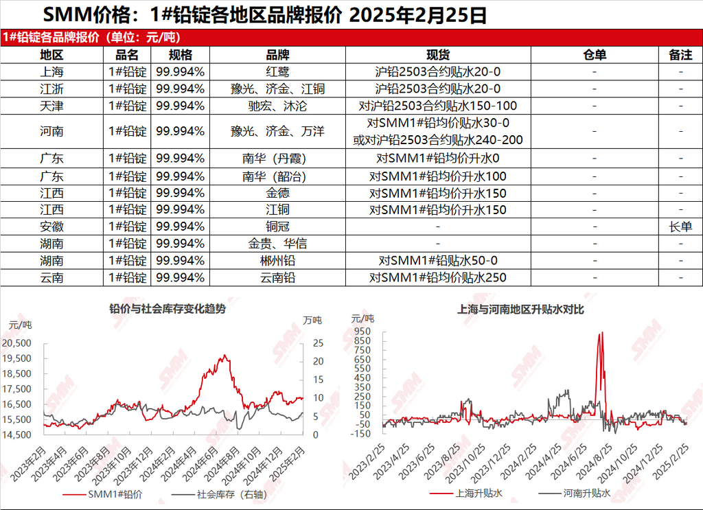 SMM, February 25: In the Shanghai market, Honglu lead was quoted at 17,090-17,110 yuan/mt, with discounts of 20-0 yuan/mt against the SHFE 2503 contract. In Jiangsu and Zhejiang regions, Yuguang, Jijin, and JCC lead were quoted at 17,090-17,110 yuan/mt, with discounts of 20-0 yuan/mt against the SHFE 2503 contract. SHFE lead continued to consolidate at high levels, and suppliers' premiums and discounts remained unchanged from the previous day. Meanwhile, smelters' ex-factory quotations for cargoes self-picked up from production sites were maintained at discounts of 50 yuan/mt to premiums of 150 yuan/mt against the SMM 1# lead average price, with a few premium quotations adjusted downward. Secondary refined lead was quoted at discounts of 100-0 yuan/mt against the SMM 1# lead average price ex-factory, with some as low as discounts of 150 yuan/mt. Additionally, downstream enterprises stabilized production after resumption, purchasing raw materials as needed. Some enterprises prioritized shipments under long-term contracts, while spot order transactions were moderate.