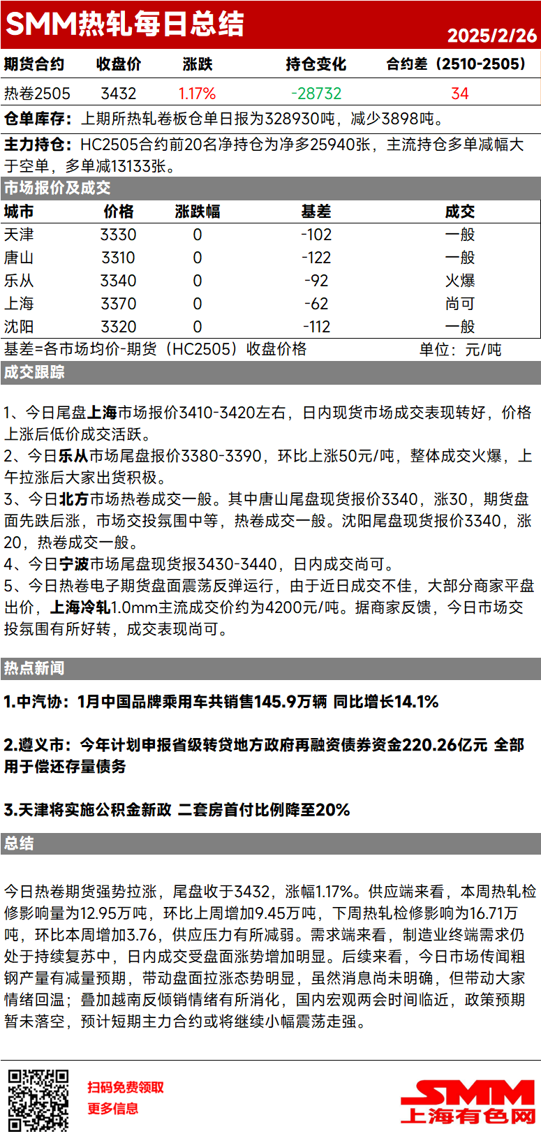 HRC futures surged strongly today, closing at 3,432 with a 1.17% increase. Supply side, this week's impact from HRC maintenance reached 129,500 mt, up 94,500 mt WoW. Next week's impact from HRC maintenance is expected to be 167,100 mt, up 3.76 WoW, slightly easing supply pressure. Demand side, end-use demand in the manufacturing sector remains in a continuous recovery, with intraday transactions significantly boosted by the futures market's rally. Looking ahead, there were market rumors today about a potential reduction in crude steel production, which clearly drove the futures market upward. Although the news is not yet confirmed, it has warmed market sentiment. Additionally, the anti-dumping sentiment regarding Vietnam has somewhat subsided, and with the domestic macro Two Sessions approaching, policy expectations have not been disappointed. The most-traded contract is expected to continue a slight upward fluctuation in the short term.