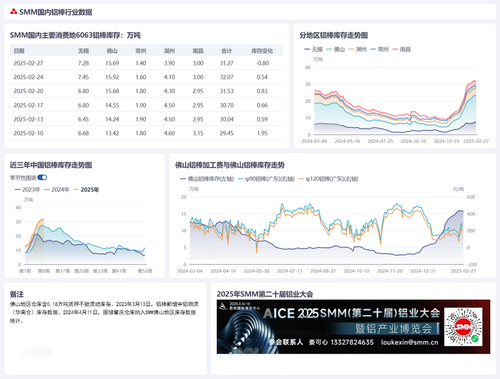 According to the latest data from SMM, as of February 27, 2025, domestic aluminum billet social inventory decreased to 312,700 mt mid-week after surpassing the 320,000 mt threshold, down 8,000 mt from Monday but up 89,100 mt compared to pre-holiday levels (January 27). While inventory showed upward momentum after breaking the 300,000 mt mark, the pace of increase has noticeably slowed. Notably, post-Lantern Festival, accelerated resumption of operations at downstream extrusion plants drove a rebound in outflows from warehouses. Last week's outflows reached 51,500 mt (up 7,300 mt WoW), setting a new high for the year. Although there are suspicions of aluminum billet manufacturers offering volume discounts, this still reflects a certain degree of end-user restocking demand. Based on the inventory trends observed over the past seven years following the Chinese New Year, SMM predicts that the destocking turning point for aluminum billets is likely to appear earlier than that for aluminum ingots, with the inventory turning point expected to emerge by late February or early March. The forecast for the Q1 aluminum billet inventory peak remains around 350,000 mt.