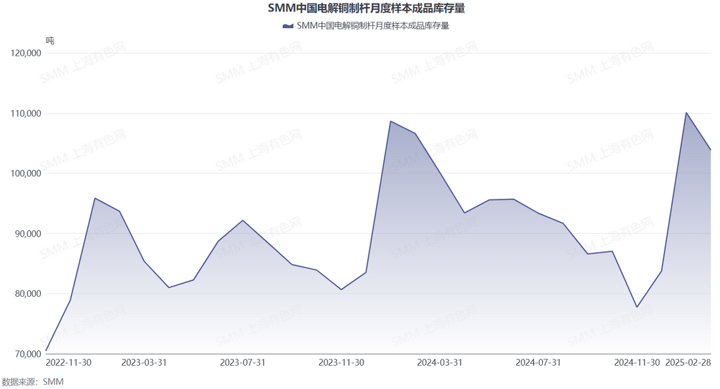 As the festive atmosphere of the Year of the Snake gradually faded, copper prices exceeded market expectations after the holiday due to repeated fluctuations in US tariff expectations. According to SMM data, the average price of SMM #1 copper cathode in February was 76,863.61 yuan/mt, up 1,840 yuan/mt MoM from January. However, due to the post-holiday shortage of secondary copper raw materials, secondary copper prices remained firm, and the price spread between copper cathode rods and secondary copper rods failed to widen significantly. According to SMM statistics, in February, the average price spread between secondary copper rods in Jiangxi and copper cathode rods for power use in east China was 987 yuan/mt, narrowing by 231 yuan/mt MoM. Copper cathode rods maintained an economic advantage. Although the price spread between copper cathode rods and secondary copper rods narrowed, the surge in copper prices exceeded the psychological price level of downstream enterprises, significantly suppressing post-holiday cargo pick-up. Only some new energy and high-end product orders recovered well, while cable orders showed no significant rebound, and end-use consumption remained weak compared to the same period. In February 2025, the operating rate of copper cathode rod enterprises declined both MoM and compared to the expected value.