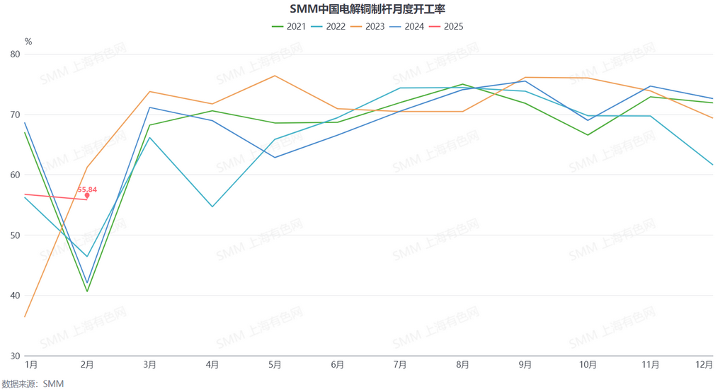 In February, the operating rate of the copper cathode rod industry recorded 55.84%, up 13.79 percentage points YoY (operating rate in February last year was 42.05%).