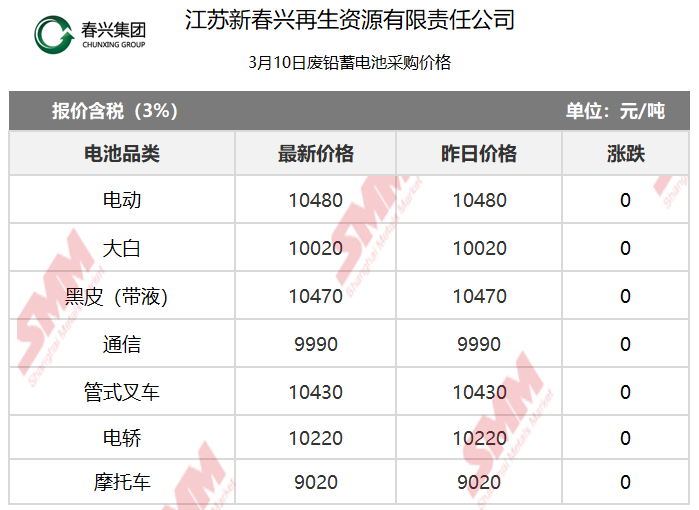 March 10 Jiangsu New Chunxing Scrap Battery Purchase Quotation