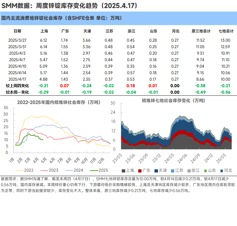 【SMM Data】SMM reported on April 17: According to SMM communication, as of Thursday, April 17, the total zinc ingot inventory in seven regions monitored by SMM was 100,000 mt, a decrease of 2,100 mt compared to April 14 and a decrease of 5,600 mt compared to April 17, indicating a domestic inventory reduction. This week, the price center of zinc continued to decline, and downstream buyers showed high purchasing sentiment in the face of low prices. Inventories in Shanghai and Tianjin decreased significantly, while warehouse arrivals in Guangdong were relatively normal during the week. Meanwhile, downstream pick-up of goods was relatively low, resulting in relatively small inventory changes. Overall, the inventory in the original three regions decreased by 2,100 mt, and the inventory in the seven regions decreased by 5,600 mt.