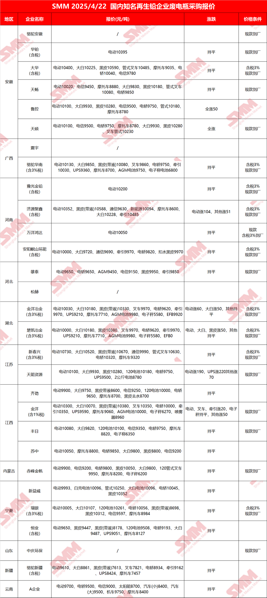SMM April 22, 2025 Scrap Battery Purchase Quotation from a Well-Known Domestic Secondary Lead Enterprise