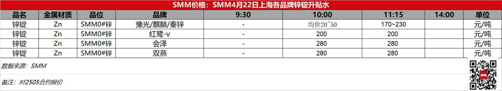Premiums and Discounts for Various Brands of 0# Zinc in Shanghai on April 22