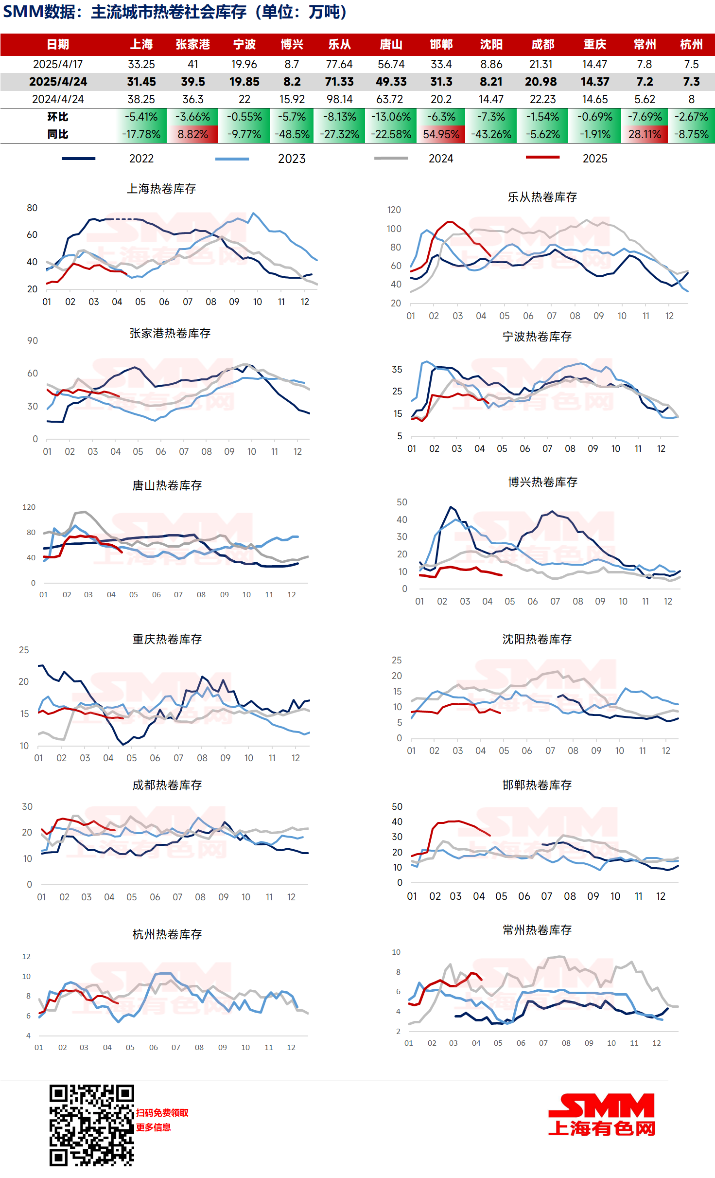 This week, Shanghai's HRC inventory was 31.45 mt, down 1.8 mt WoW, a 5.41% decline; down 18.82% YoY, and down 16.53% on a lunar calendar basis.