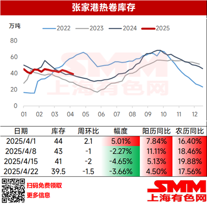 This week, Zhangjiagang's HRC inventory was 395,000 mt, down 15,000 mt WoW, a 3.66% decline; up 4.50% YoY, and up 17.56% on a lunar calendar basis.