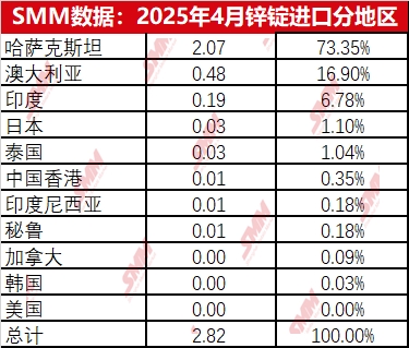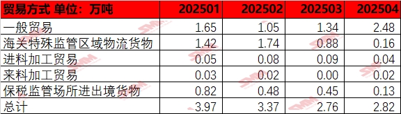 The top three countries for refined zinc imports in April were Kazakhstan (20,700 mt, accounting for 73.35%), Australia (4,800 mt, accounting for 16.9%), and India (1,900 mt, accounting for 6.78%). From the perspective of country-specific data, there was a significant increase in zinc ingot imports from Kazakhstan. In terms of trade mode, Ordinary Trade accounted for approximately 87% of the imports. This was mainly due to the intermittent opening of the import window in April, which provided opportunities for spot order imports, keeping zinc ingot imports at a high level.