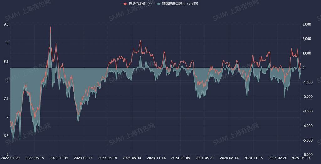 Entering May, with the easing of the Sino-US trade dispute on the macro front, market sentiment has somewhat improved. However, concerns over weak US economic data have offset the earlier optimism from tariff reductions, increasing fears of a US economic recession and weakening overseas sentiment. On the fundamentals side, due to smelters' expectations for production increases in the future and the resulting procurement and stocking demand, domestic ore TCs struggled to rise in May. However, with expectations for an increase in imported ore, import TCs have increased somewhat, maintaining an overall high level. Against the backdrop of smelter maintenance in China in May, spot cargo arrivals have fallen short, keeping social inventory at a low level and providing bottom support for zinc prices. Coupled with the current easing of trade disputes and expectations for a rush in exports from some downstream sectors, with the domestic market outperforming the overseas market, the SHFE/LME zinc price ratio has risen, opening the refined zinc import window. As a result, imported zinc ingots from overseas have flowed in, and imports are expected to increase to around 35,000 mt.