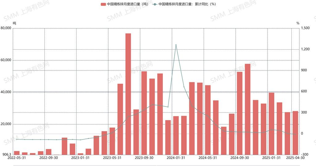 According to the latest customs data, China's refined zinc imports reached 28,200 mt in April 2025, up 600 mt MoM or 2.4% MoM, but down 38.66% YoY. The cumulative imports of refined zinc from January to April stood at 129,200 mt, a year-on-year decrease of 9.44%. In April, China exported 2,500 mt of refined zinc, resulting in a net import of 25,700 mt of refined zinc for the month.