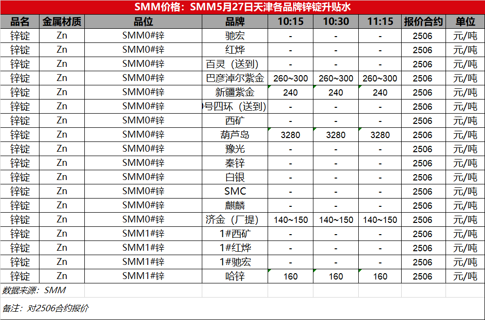 SMM, May 27: In the Tianjin market, mainstream transactions for #0 zinc ingot were concluded at 22,710-23,060 yuan/mt, with Zijin transactions at 22,770-23,110 yuan/mt, and #1 zinc ingot transactions at around 22,390-23,110 yuan/mt. Huludao reported prices at 26,090 yuan/mt. The premium for ordinary #0 zinc against the 2506 contract was reported at around 200-240 yuan/mt, while Zijin reported a premium of premium around 260-300 yuan/mt against the 2506 contract. The Tianjin market was reported to be on par with the Shanghai market. By the close of the morning session, Xinzhi reported a premium of around 240 yuan/mt against the 06 contract, while Hazin reported a premium of around 160 yuan/mt against the 06 contract. High-end brand Zijin reported a premium of around 260-300 yuan/mt against the 06 contract. The futures market was trading at a relatively high level with fluctuations. Downstream buyers were cautious about purchasing due to high prices, primarily focusing on restocking to meet immediate needs. The implementation of new long-term contracts began, and downstream consumption pulled back somewhat, with overall demand being average. Traders showed a tendency to refuse to budge on prices in their offers today, with premiums holding steady. Overall market transactions were average.