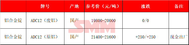 In the spot market, today's SMM A00 aluminum price rose 240 yuan/mt from the previous trading day to 20,400 yuan/mt. Domestic SMM ADC12 prices held steady in the range of 19,800-20,000 yuan/mt. Today, the ADC12 market generally held steady quotes or rose by 100 yuan/mt. Currently in the off-season, weak demand continues to suppress its upside room in prices, while the cost side provides some support. In the short term, ADC12 spot prices will remain rangebound, and the discount status to A00 may continue.