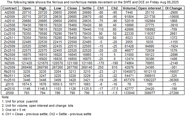 The following table shows the ferrous and nonferrous metals movement on the SHFE and DCE on 08 Aug, 2025