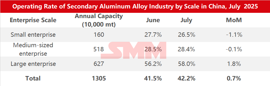According to SMM survey statistics, the operating rate of the secondary aluminum industry in July 2025 rebounded by 0.7 percentage points MoM from June to 42.2%, with a YoY increase of 2.8%.