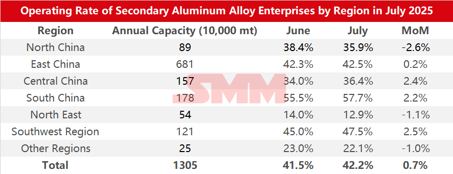 Survey data on the operating rate of secondary aluminum alloy enterprises by region in July 2025: