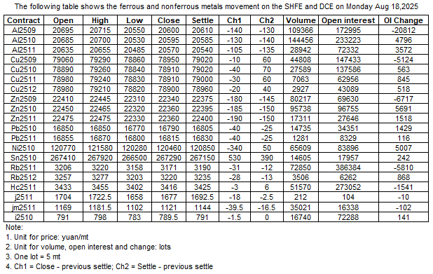 The following table shows the ferrous and nonferrous metals movement on the SHFE and DCE on 18 Aug, 2025