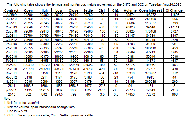 The following table shows the ferrous and nonferrous metals movement on the SHFE and DCE on 26 Aug, 2025