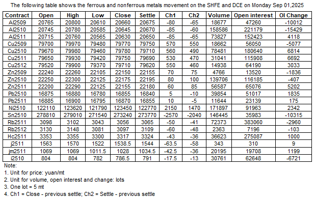 The following table shows the ferrous and nonferrous metals movement on the SHFE and DCE on 01 Sep , 2025