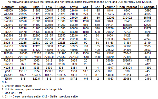 The following table shows the ferrous and nonferrous metals movement on the SHFE and DCE on 12 Sep , 2025