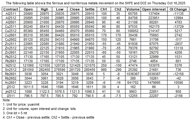 The following table shows the ferrous and nonferrous metals movement on the SHFE and DCE on 16 Oct , 2025