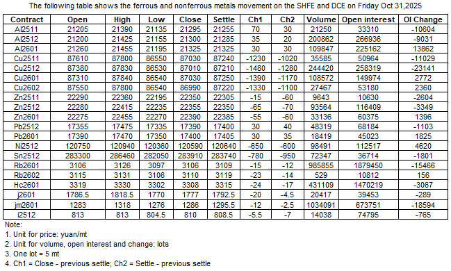 The following table shows the ferrous and nonferrous metals movement on the SHFE and DCE on 31 Oct , 2025