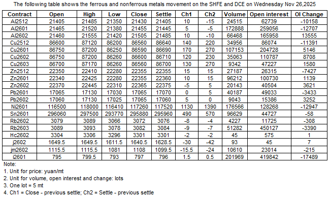 The following table shows the ferrous and nonferrous metals movement on the SHFE and DCE on 26 Nov , 2025