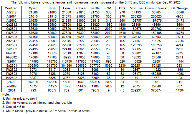 The following table shows the ferrous and nonferrous metals movement on the SHFE and DCE on 01 Dec , 2025