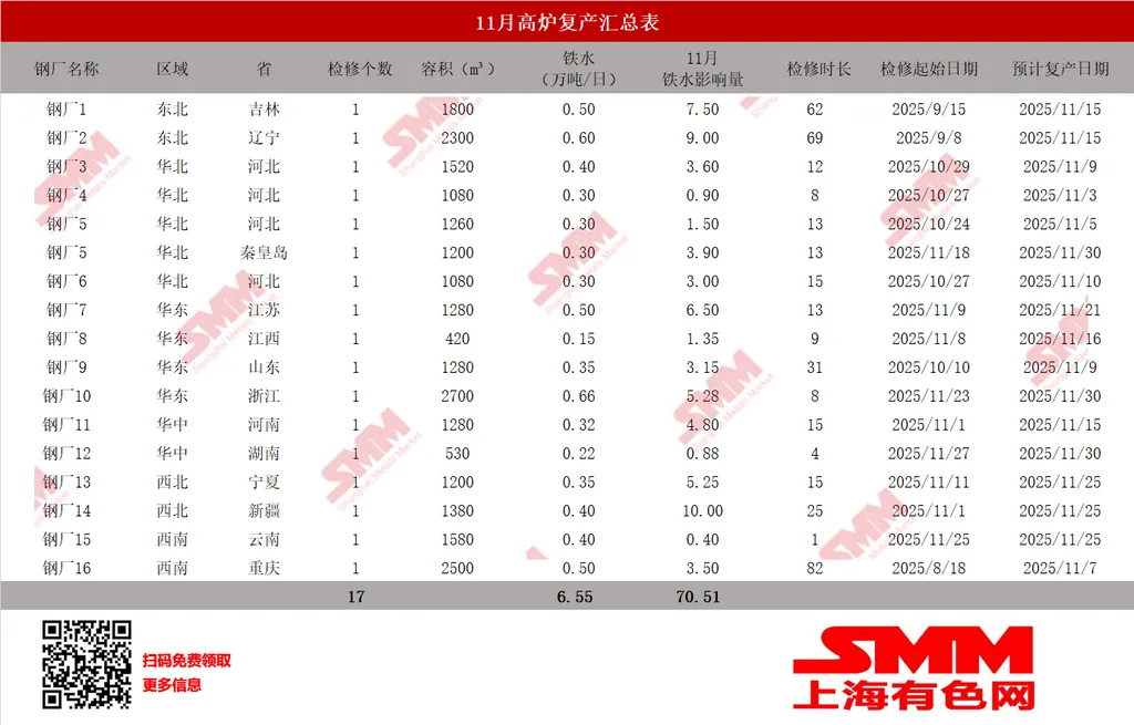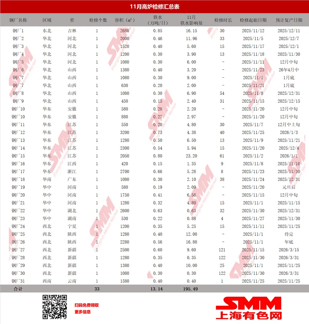 According to SMM survey data, 33 blast furnaces underwent maintenance in November, resulting in a daily hot metal reduction of 130,000 mt. Meanwhile, 17 blast furnaces resumed production, increasing daily hot metal output by 70,000 mt. Maintenance this month was mainly concentrated in Northwest, North, and East China; some steel mills in the Northwest region began winter breaks, while other regions primarily conducted annual maintenance. SMM survey data shows that blast furnace maintenance in November led to a net decrease of 5.62 million mt in hot metal production, down 850,000 mt MoM from October. Based on SMM's daily average hot metal production data, the daily average pig iron production in November fell by 20,000 mt compared to October.