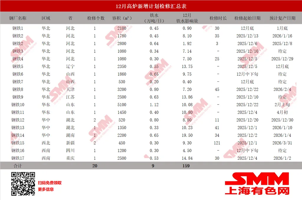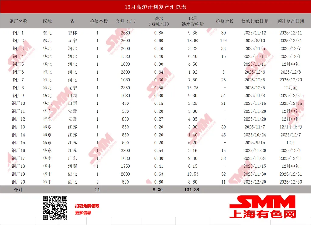 As of now, SMM survey statistics indicate that 20 blast furnaces are scheduled for maintenance in December, with an expected daily hot metal reduction of 90,000 mt; meanwhile, 21 blast furnaces are planned to resume production, with an expected daily hot metal increase of 80,000 mt. Current maintenance is mostly concentrated in North China, mainly for annual overhauls. Considering the year-end, steel mills are increasing production control and annual maintenance plans. Additionally, some regions have been in loss-making positions for a long time; although short-term steel mill profits have improved recently, inland steel mills remain in a loss-making state. If construction steel demand declines further, blast furnace maintenance at steel mills is expected to increase. Furthermore, based on SMM's historical maintenance data, December is a peak season for blast furnace maintenance. The actual number of maintenance activities is expected to exceed current statistics. Overall, monthly pig iron production in December is projected to continue hitting bottom.