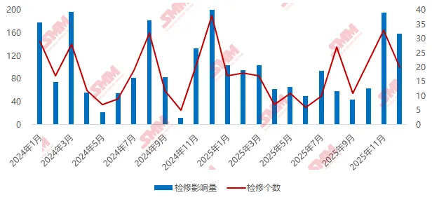 SMM Blast Furnace Maintenance Count and Impact Since 2024 (Monthly)