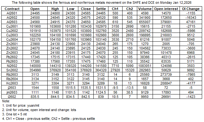 The following table shows the ferrous and nonferrous metals movement on the SHFE and DCE on 12 Jan , 2026